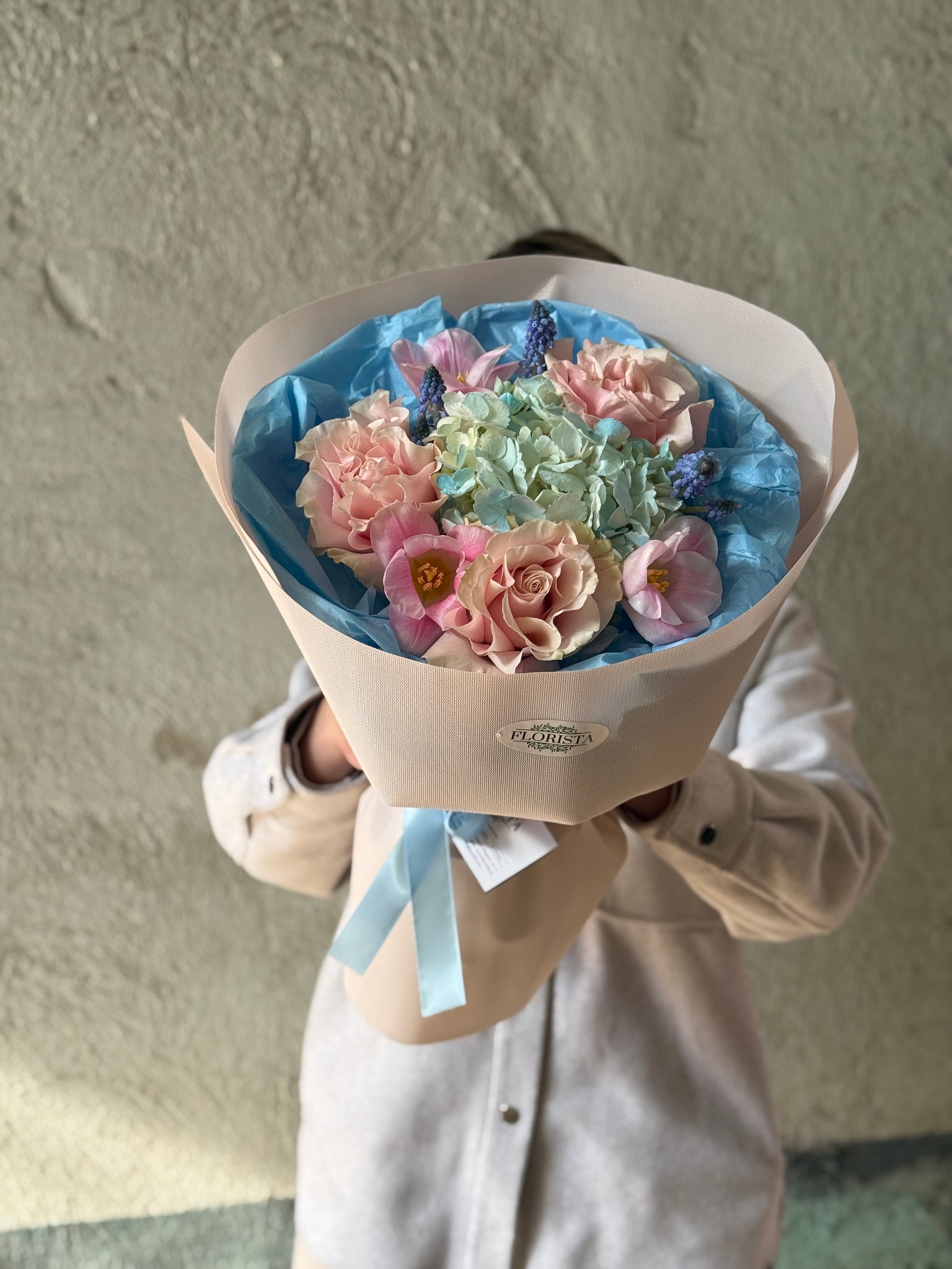 Buchetul din poză este dimensiunea Small şi este compus din hortensie, 3 muscari, 3 trandafiri Ecuador petalați, 3 lalele petalate și ambalaj.