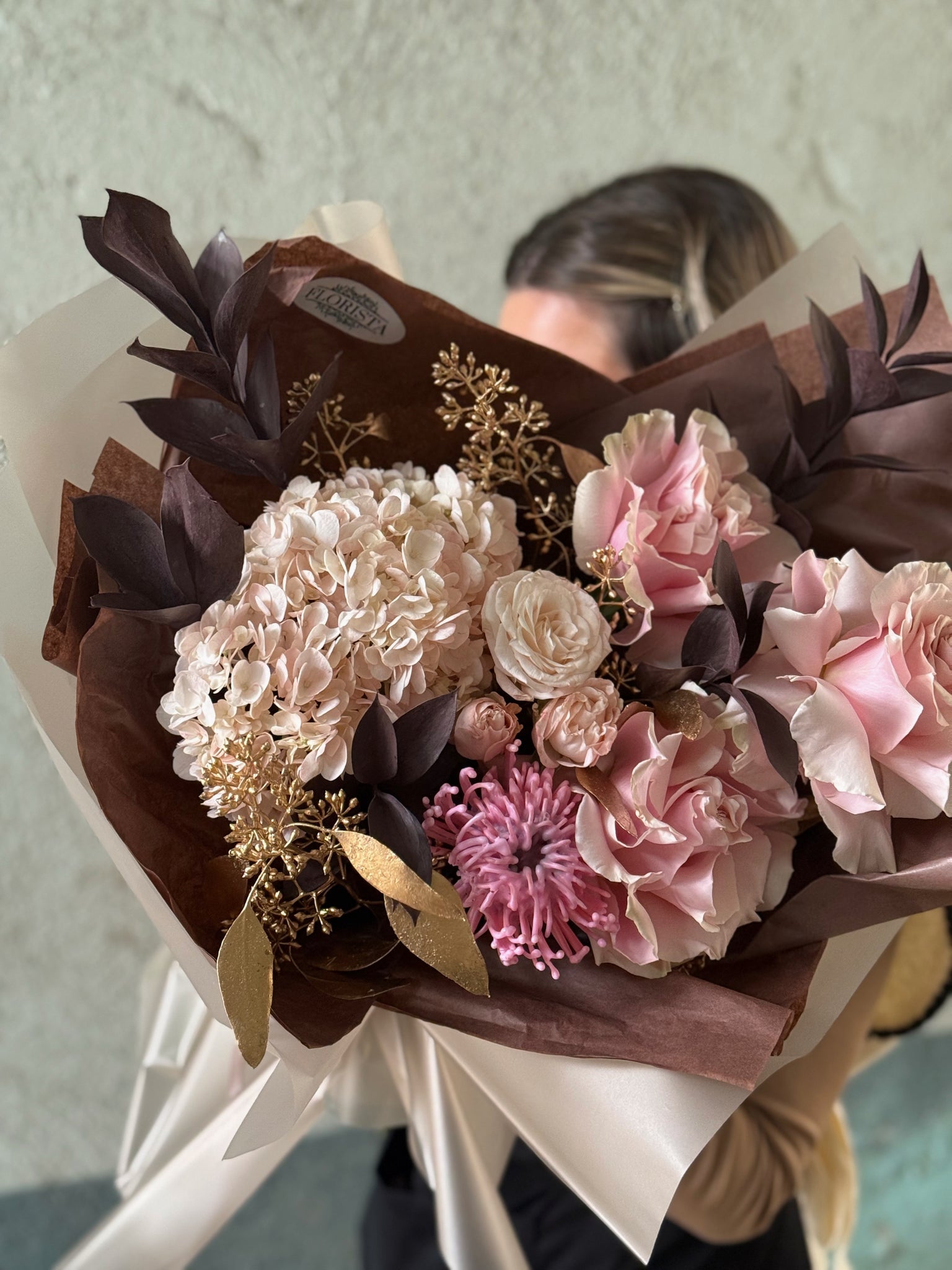 Un buchet spectaculos, plin de rafinament și căldură, „Gold Love” este o declarație de iubire în tonuri luxoase. Combinația delicată de hortensie roz pal și trandafiri Ecuador se împletește armonios cu trandafirii spray și accentele exotice de leucospermum cerat, creând un joc de texturi și culori aparte.