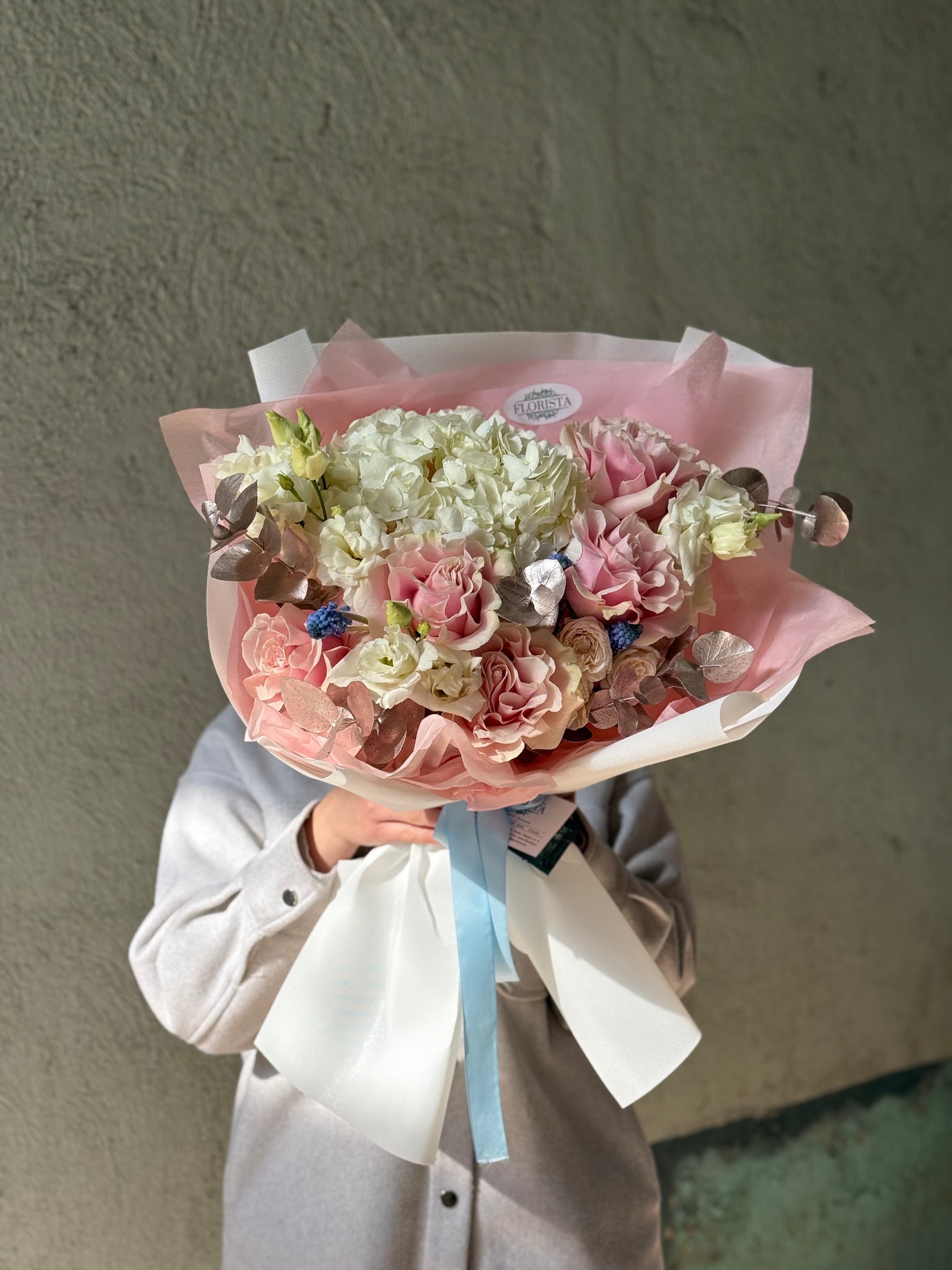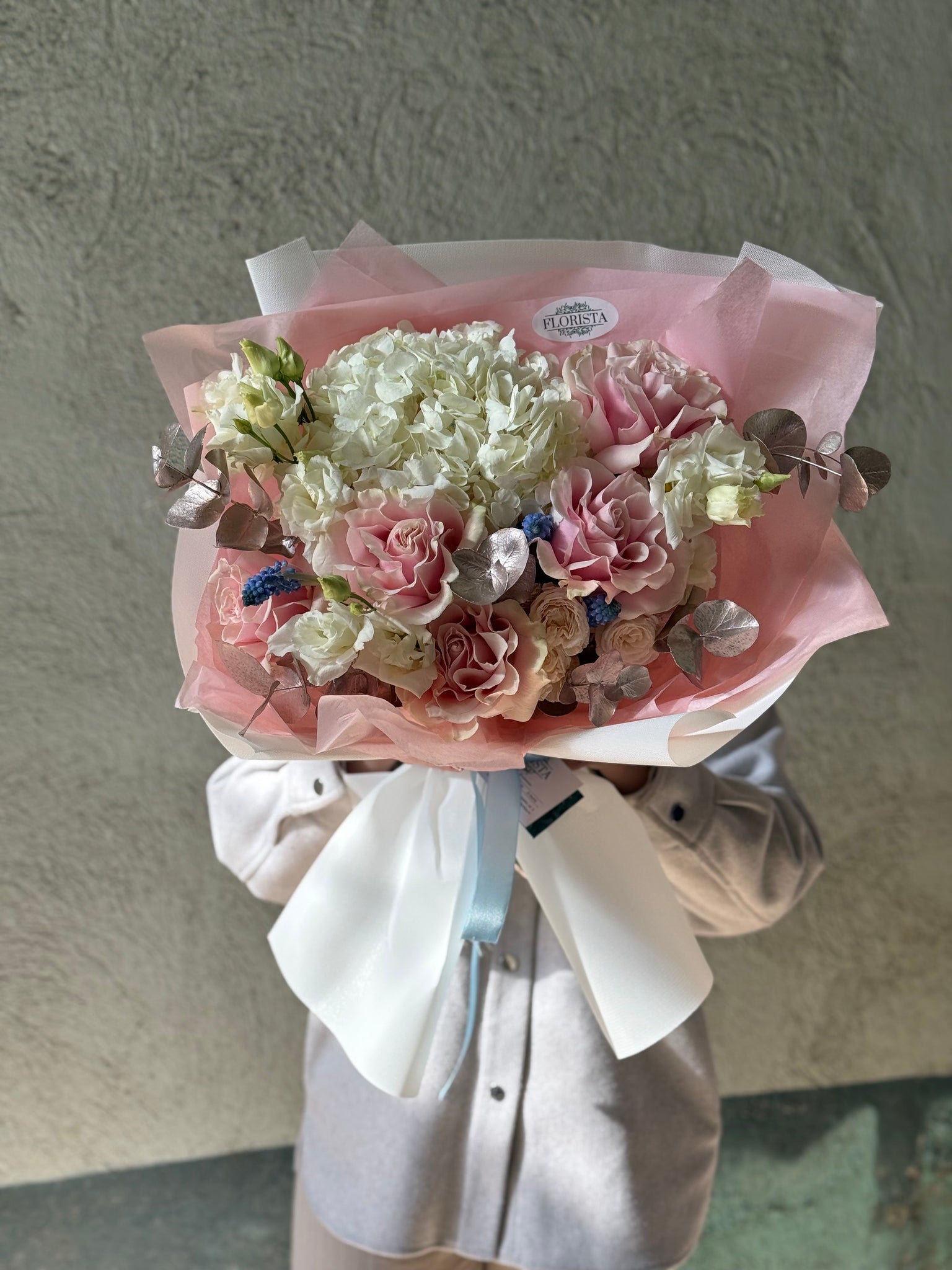 Compus din 1 hortensie, 5 trandafiri Ecuador petalați, 2 lisianthus, 3 muscari, eucalypt champagne și ambalaj.